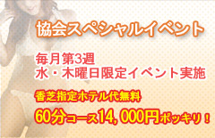 | ■毎月第3週目の水・木曜限定イベント■ ホテル代無料!14,000円ポッキリ! 毎月第3週目の水曜日と木曜日はホテル代が無料に! 協会加盟店なら60分14,000円ポッキリでお楽しみいただけますので是非この機会にご利用下さいませ。 ※フリーのみ適応になっております。指名の際は別途指名料を頂きます。 ※ほかの割引と併用はご遠慮願います。 ※香芝指定のホテルのみとなっております。 ※受付時に『協会のホームページを見た』とお申し付け下さい。 |